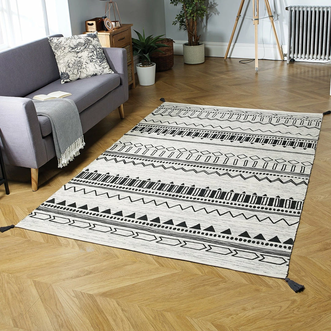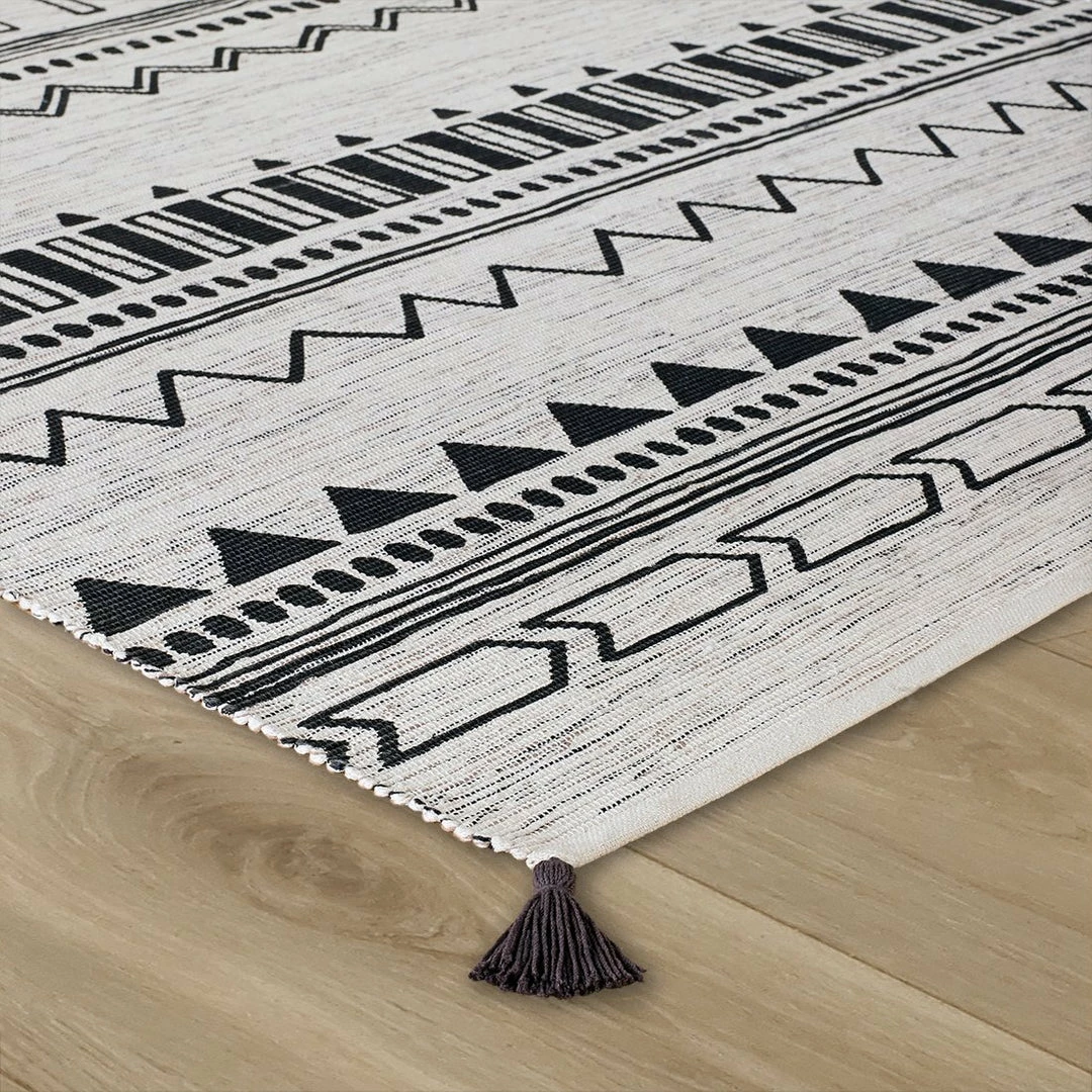 These rugs from nomadic collection are perfect for bringing a simple stylish tribal design to your home. Added tassels give each piece an authentic rustic appeal. Printed on 100% Cotton flat pile, this is a great rug for use though out your home.