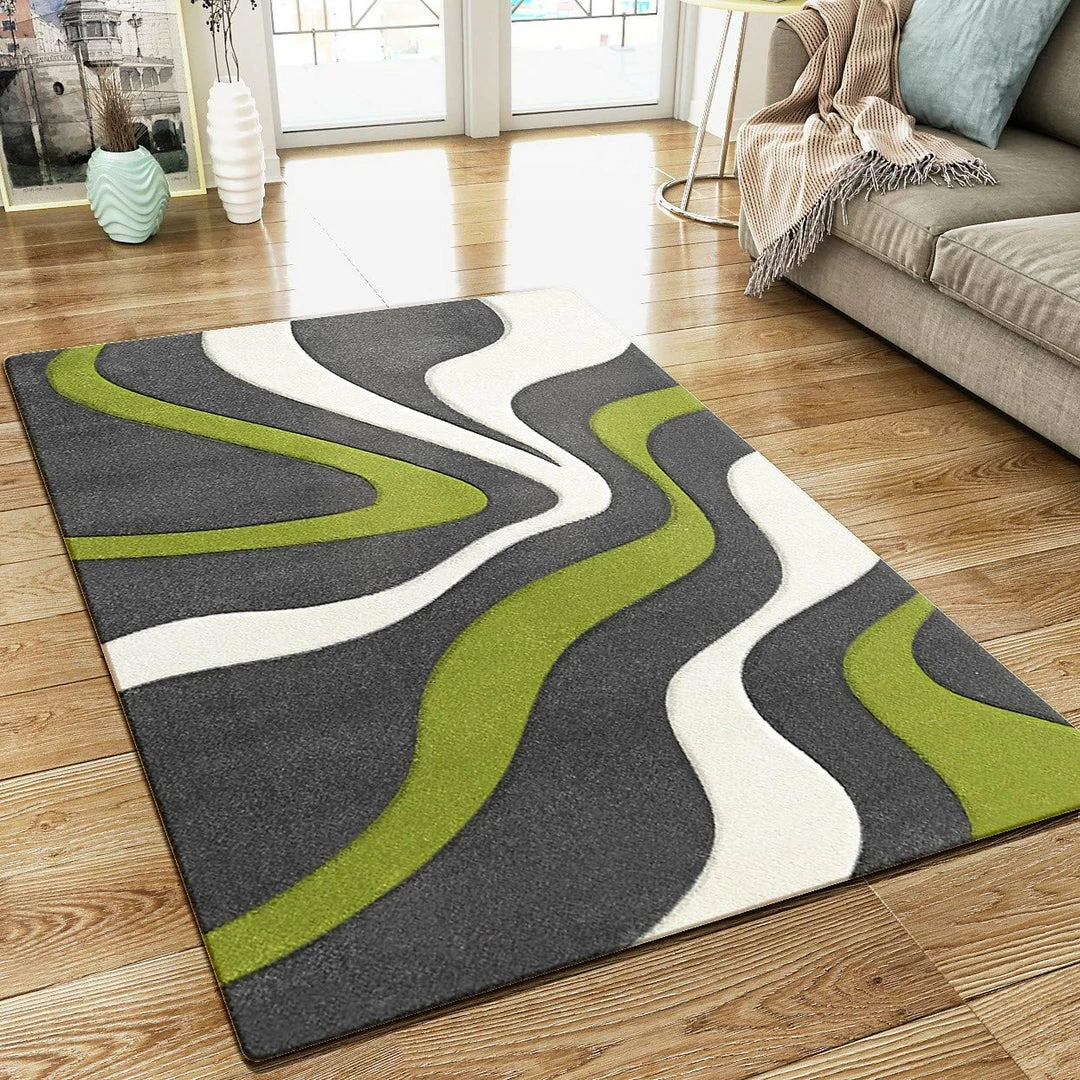 Xrugs Abstract Rug Grey Green White Wave Design Contour Cut Woven Low Pile Carpet Mat For Living Room & Bedroom Modern